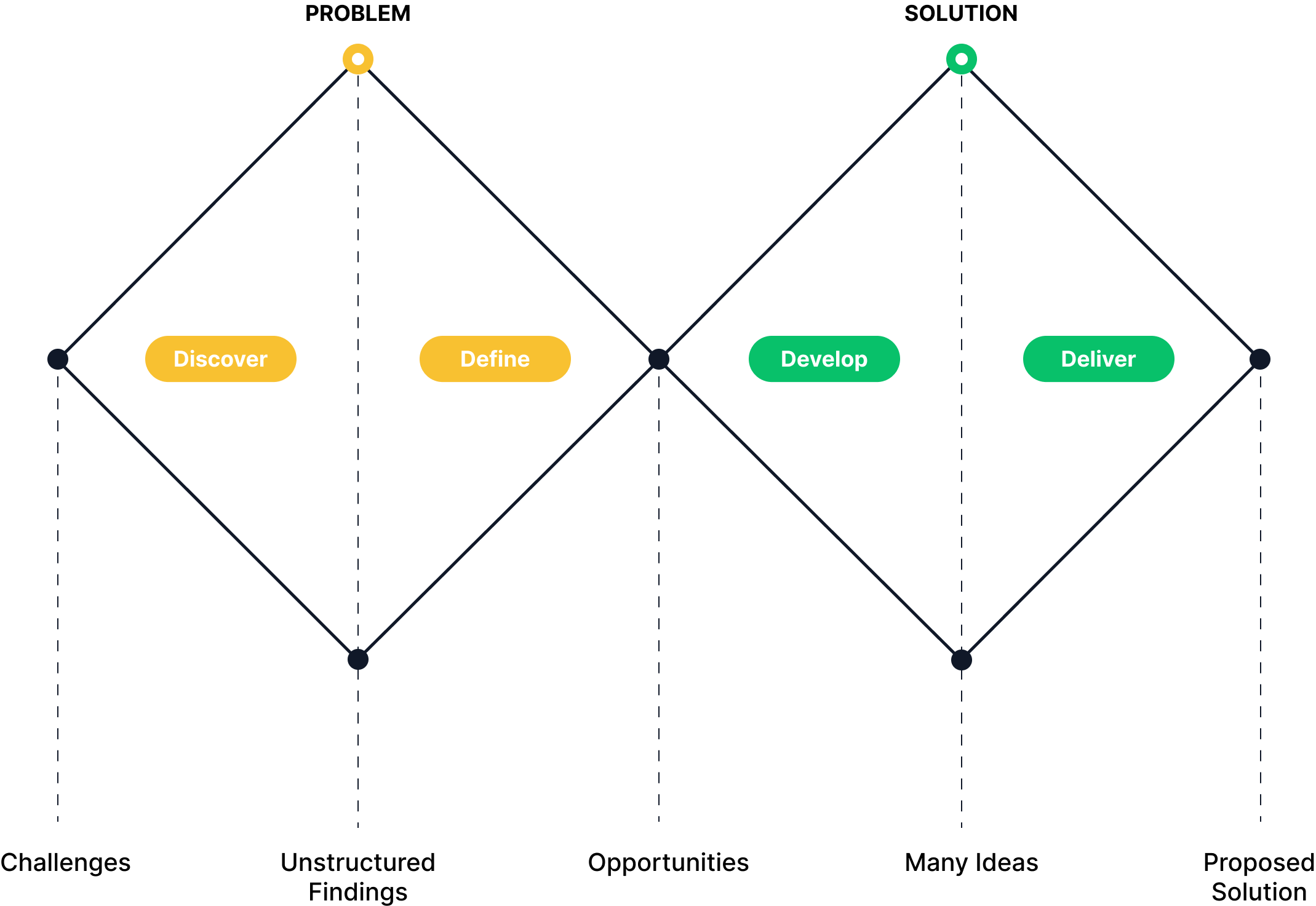 Karmaşık kullanıcı deneyimi problemlerini anlamlandırıp, bütüncül ve işlevsel çözümlere dönüştürmek için Double Diamond metodolojisini kullanıyorum.